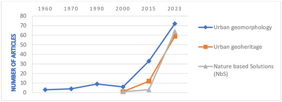 Statistics of articles, analyzed by year, on urban geomorphology, urban geoheritage, and Nature-Based Solutions (NbSs).
