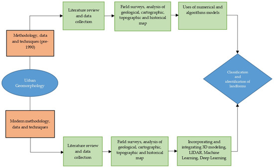 The field of urban geomorphology has evolved significantly in response to the challenges posed by rapid urbanization and advancements in technology (Figure 4). This transformation encompasses a shift from traditional geological and mapping methods to the incorporation of modern tools such as LiDAR, GIS, and machine learning, resulting in a more comprehensive understanding of urban landscapes and their historical significance. Moreover, the interconnection between urban geomorphology and geoheritage, coupled with a heightened focus on addressing climate change and disaster mitigation, has propelled these disciplines into the forefront of 21st century urban studies. The changing methodologies employed in urban geomorphology assessments offer a clear reflection of the evolving landscape of research. Historically, methodologies were rooted in exhaustive literature reviews and data collection, with a strong emphasis on field surveys and the analysis of various maps and models for the classification of urban landforms. After the 19th century, noticeable advancements in research methodologies in urban geomorphology became apparent.