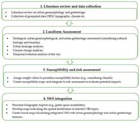 Nature-Based Solution methodologies can be integrated following an in-depth urban geomorphological and geoheritage assessment. This integration is possible due to the shared emphasis on understanding and utilizing the geological and cultural characteristics of the urban landscape. For instance, after identifying and categorizing landforms and urban geoheritage elements, the subsequent application of NbS methodologies aligns with the geological and cultural context identified earlier.