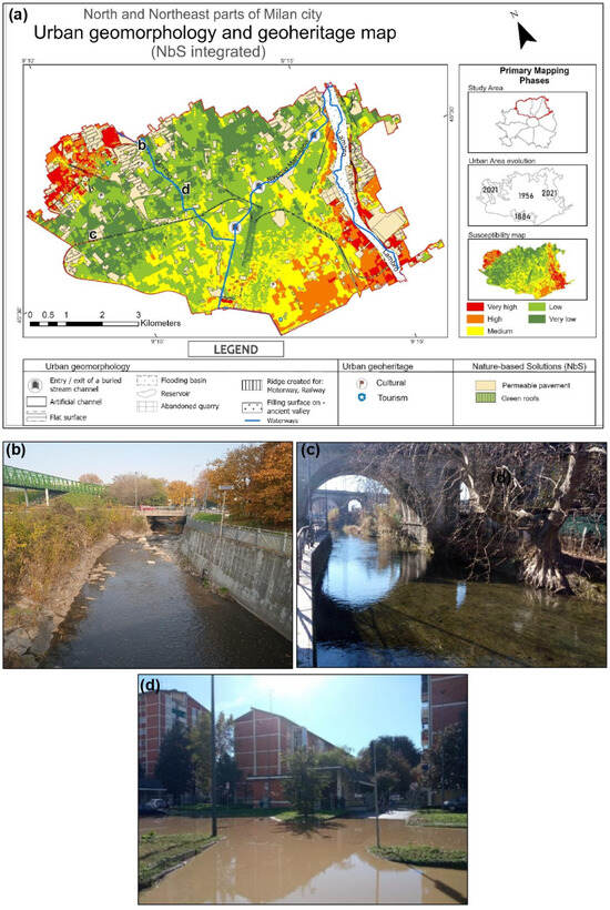 The paper further aims to introduce a methodological framework and demonstrate its practical application. Milan was selected as the implementation site for the proposed methodology due to its rich historical heritage, dynamic urban landscape, and the presence of various environmental and urban challenges. Particularly notable are Milan’s northern rivers which historically presented considerable flood risks [56]. Therefore, the study included the northern and northeastern zones of the city of Milan that are affected by floods caused by the Seveso and Lambro rivers. Consequently, the final integrated map of urban geomorphology, geoheritage, and NbSs for the area was developed and prepared based on the proposed methodology.