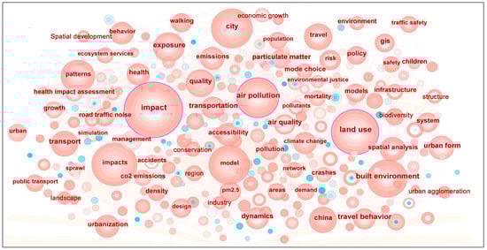 Using the bibliometric visual analysis software Citespace to analyze the research directions and hotspots, the literature was imported with the interval set to 1 year and the nodes set to keywords, and the main areas of research and research hotspot mapping were obtained after finishing. From the mapping, it can be seen that the main hot words of the research related to the development and protection of space by transportation are air pollution, land use, transportation network, spatial structure, economic growth, impact, city and region, accessibility, and so on. Judging from the degree of association of each keyword, the relevant research fields of the established literature are relatively broad, involving various social, economic, and ecological factors, and the themes of land use, economic growth, and air pollution are the hot spots of long-term concern and research in the academic community. In addition, with the development of urban agglomerations and the construction of high-speed railroads, the impact of high-speed transportation on land space at the regional level has also become a hot topic (Figure 3).