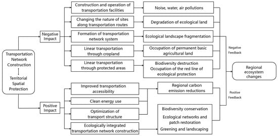 With regard to the impacts of transportation on the protection of territorial space (Figure 5): From the point of view of the negative effects of transportation infrastructure, the construction and operation of transportation will result in noise, water, and atmospheric pollution; the degradation of ecological land [146,147]; the fragmentation of landscapes [148,149]; the occupation and fragmentation of protected areas [150,151]; and the destruction of species diversity [152,153]. From the perspective of positive effects of transportation infrastructure, the improvement of transportation accessibility, the use of clean energy, and the optimization of transportation structure will be conducive to the reduction of regional carbon emissions [154,155]; the construction of an ecologically integrated transportation network will promote the ecological restoration of areas along the routes [156,157]. Based on the superposition of positive and negative effects, transportation facilities will ultimately affect changes in the regional ecological environment systems.