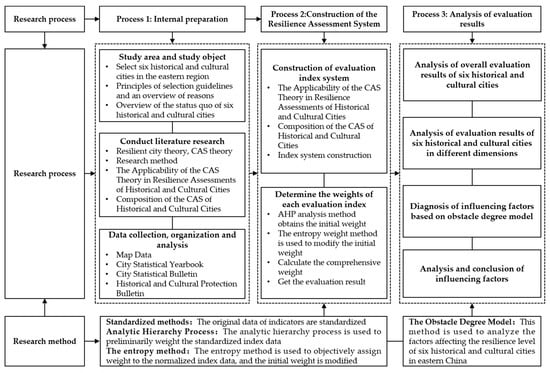 The research methods involved in this paper include the standardization method, the analytic hierarchy process, the entropy evaluation method, and the obstacle degree method. After the data collection is completed, the dimensionality of indicators of different dimensions is reduced using standardized methods to reduce the dimensionality of data to the range [0, 1] (see Section 3.4). The standardized index data were weighted by an analytic hierarchy process (AHP), and the initial weights were determined after expert discussion (see Section 3.4). The entropy evaluation method was used to objectively weight the standardized indicator data, so as to modify the initially determined weights and obtain the final weights (see Section 3.4). The evaluation results of six historical and cultural cities are obtained by using the final weight. The obstacle degree method was used to explore the obstacle factors for the resilience development of six historical and cultural cities (see Section 5.1).