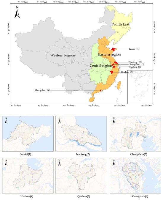 The research area covers six historical and cultural cities in east China: Yantai, Tongzhou, Changzhou, Quzhou, Huzhou, and Zhongshan (Figure 2, Table 1). According to the Opinions of the Central Committee of the Communist Party of China and the State Council on Promoting the Rise of Central China and the Opinions of the State Council on Implementing the Policies and Measures of the Great Western Development Strategy, China’s economic zones are divided into eastern, central, western, and northeastern zones (Figure 2). The study area in the eastern coastal area of China lies on the eastern edge of east China and the western bank of the Pacific Ocean, tucked away between 18°09′35″ N–42°37′31″ N and 108°37′26″ E–122°13′42″ E and covering eight provinces and three municipalities, namely, from north to south, Beijing, Tianjin, Hebei, Shandong, Jiangsu, Shanghai, Zhejiang, Fujian, Taiwan, Guangdong, and Hainan. The reasons for selecting the study area are as follows: