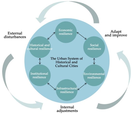 According to the CAS theory, this paper studied the interplay between the factors of the selected historical towns. When facing an external impact, the complex system of historical and cultural cities undergoes an internal adaptation through the interaction between internal subsystems and the internal elements of the subsystems. The historical towns with better resilience usually maintain sound operation for all factors and obtain a dynamic balance between all factors and all links. The city system based on the CAS theory is composed of economic, social, environmental, infrastructural, and institutional factors. Historical and cultural cities boast not only the property of cities and dwellings but also the property of legacy, including historical and cultural traditions, religions, and beliefs, as well as the historical and cultural systems of cities [41,42].