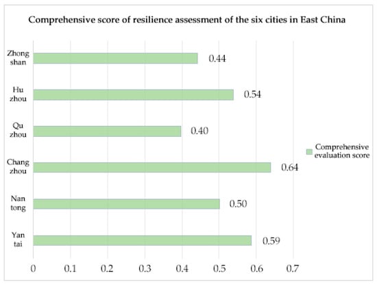 Therefore, the degrees of resilience for the six historical and cultural cities in east China are different (Figure 5). According to the calculation steps of the resilience assessment index system for historical and cultural Chinese cities, the most resilient cities are as follows: Changzhou, with the highest score of comprehensive resilience at 0.64, a comparatively high degree of resilience; Yantai, the second, with a middling score of 0.59; Huzhou, the third, with a middling score of 0.54; Nantong, the fourth, with a middling score of 0.50; Zhongshan, the fifth, with a comparatively low score of 0.44; Quzhou, the last, with a comparatively low score of 0.40.