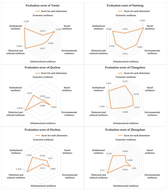 An internal vertical analysis of the cities, focusing on different dimensions, indicated that Yantai boasted advantages in terms of its institutional resilience, with a score of 0.1783, but showcased a comparatively low score for environmental resilience, with a score of 0.0453; Nantong obtained a comparatively high score for social resilience, with a score of 0.1393, but achieved a comparatively low score for economic resilience and historical and cultural resilience; Changzhou obtained an advantageous score of 0.1622 for institutional resilience but comparatively low scores of 0.0608 and 0.0726, respectively, for infrastructural resilience and social resilience; Quzhou obtained an advantageous score of 0.1890 for historical and cultural resilience but a comparatively low score of 0.0024 for economic resilience; Huzhou obtained an advantageous score of 0.2105 for historical and cultural resilience but a comparatively low score of 0.0111 for infrastructural resilience; Zhongshan obtained an advantageous score of 0.1724 for historical and cultural resilience but a comparatively low score of 0.0109 for social resilience (Figure 6).