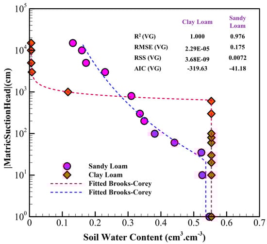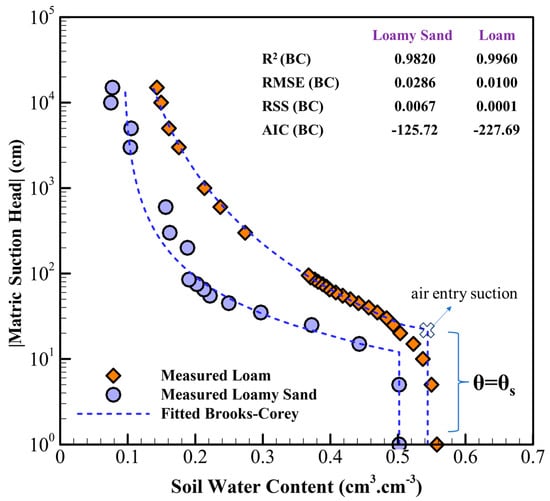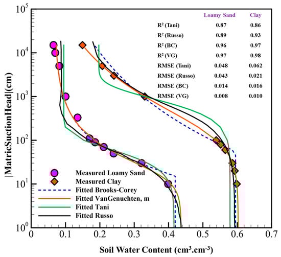 - Given the nature and behavior of Equations (19) and (20), BC and VG models show excellent fit to the asymmetric retention data around the inflection point with RMSE < 10−10 but are inherently and significantly sensitive to pure errors and outliers in the dataset. Pure errors are errors caused by the presence of random variation in the data such that despite high R2 values, the RMSE shows abnormal values (see Figure 6, Figure 7 and Figure 8).