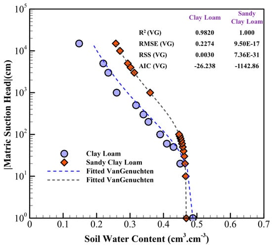 - The correlation between parameters plays a significant role in the sensitivity of the SWR model to the experimental data. In the VG model, the relationship between the three parameters of α, n, and m is such an extent that minor alteration in one parameter effectively changes the other two parameters. To better understand the sensitivity of the VG model, the correlation matrix between the VG model parameters (θr, θs, α, n, and m) for the maximum and minimum RMSE, RSS, and AIC (see Figure 6, which shows the worst and the best fits corresponding to clay loam and sandy clay loam soils) are presented in Table 5.