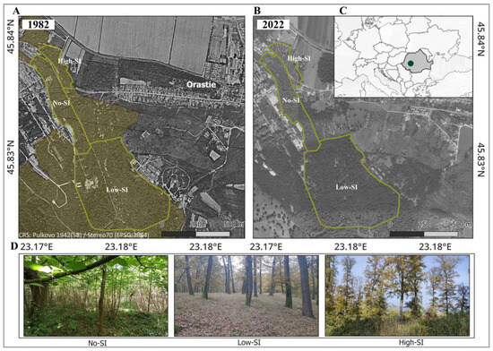 Historical map of the study site obtained from original Corona (from 1982, [41]) image strip (A) and aerial map of the studied location in 2022 (B); Study location on the southeast European map (C); Current status of the three forest types studied (D): No-SI, No Silvicultural Interventions; Low-SI, Low Silvicultural Interventions; High-SI, High Silvicultural Intervention. The shaded yellow in (A) represents the initial (i.e., the year 1982) forest landscape; The dark yellow line represents the border for each site studied in the year 2022; In (C), the green dot represents the study location.