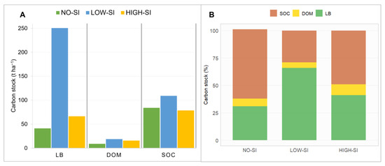 Absolute contribution of the forest carbon pools (A) and relative contribution of the components to total carbon pools (B). The LB denotes the living biomass (AGB—aboveground biomass and BGB—belowground biomass), DOM represents dead organic matter (litter and dead wood), and SOC represents soil organic carbon; No-SI refers to the forest without silvicultural interventions, Low-SI indicates the forest with low-intensity silvicultural interventions while High-SI indicates the forest with high-intensity silvicultural interventions.
