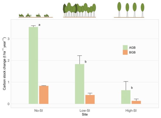 Annual carbon stock change (tonnes C ha−1 year−1) for living trees biomass (LB) components (AGB—aboveground biomass, BGB—belowground biomass) of each investigated site. Significant differences are indicated with lowercase letters. Vertical lines represent standard deviations.