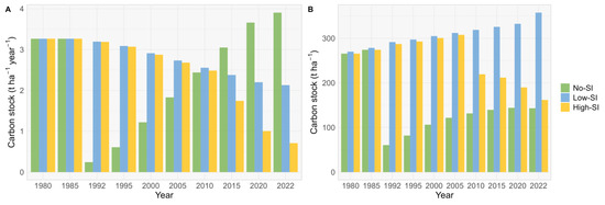 Annual carbon stock changes in living biomass (A) and annual carbon stock considering all five pools (B) on each site. No-SI refers to the forest without silvicultural interventions, Low-SI indicates the forest with low-intensity silvicultural interventions, and High-SI indicates the forest with high-intensity silvicultural interventions.