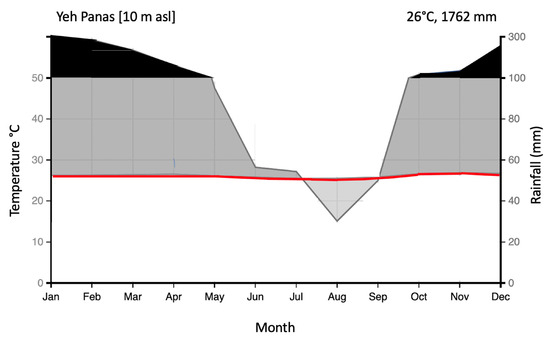 Climatic diagram of Yeh Panas, West Bali, showing a perhumid period in the austral summer and a drier period in the austral winter. Red line indicates mean temperatures.