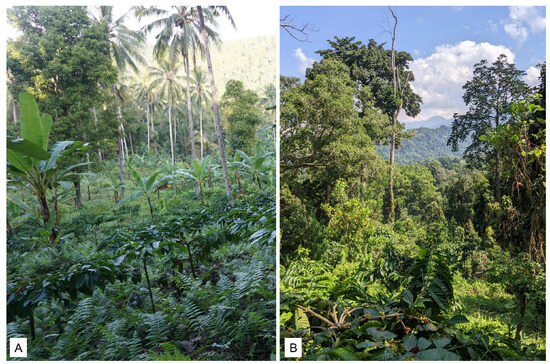 Examples of polyculture (A) and rustic (B) systems in the Yeh Embang Kauh study area in western Bali, Indonesia. Plots classed as rustic systems host native forest trees, while the tree cover in polyculture systems is only given by crop trees.