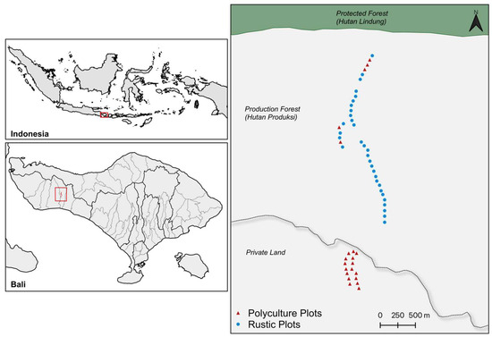 Map of the study area and geographical position of plots. Red frames indicate the position within Indonesia and Bali. Note that five plots in the production forest area were classified as polyculture plots as they had no cover from forest tree species due to past forest clearance.
