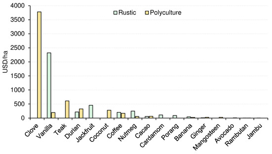 Total yields (USD/ha) provided by crops in the Yeh Embang Kauh village, Bali, Indonesia, separated by rustic and polyculture systems. Data are based on 53 agroforestry plots (32 in the rustic system, 21 in the polyculture system).