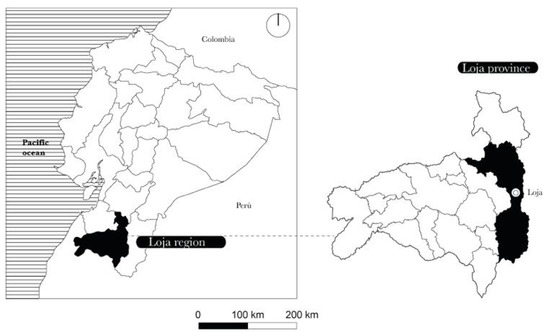 The city of Loja is located in the south of the Inter-Andean Region of the Republic of Ecuador, in the province of Loja, at an average altitude of 2065 m above sea level and 4 degrees south latitude (Figure 1). It has an area of 5732.51 hectares [36] and has 100,271 inhabitants according to the last population census of the National Institute of Statistics and Census (INEC) [37].
