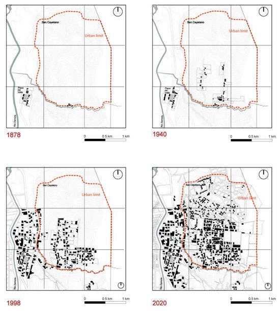 Figure 4. The development process of the San Cayetano neighborhood from its beginning in 1878 to its progressive consolidation, as evidenced by the progressive occupation of the hillside for urban expansion. Source: the authors (2024).