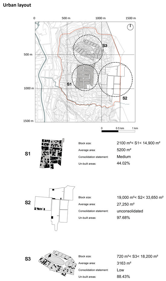 Figure 7. Urban layout. Differences in size and consolidation status of lots in three sectors of the San Cayetano neighborhood. The cartography provided is from the year 2020. Elaborated and edited by the authors (2024).