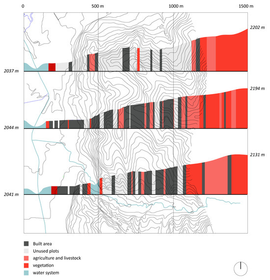 Figure 8. Topographical and land use sections. The alternation of uses between rural and urban can be observed in the topographical section of the San Cayetano district. Source: the authors (2024).