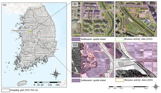Study area and spatial extent for constructing activity data. (a) Distribution of sample region for constructing activity data in South Korea; (b) current settlements’ spatial extent and activity data for biomass; (c) the current spatial extent of settlements and land use change is determined by constructing and analyzing activity data from 20 years ago.