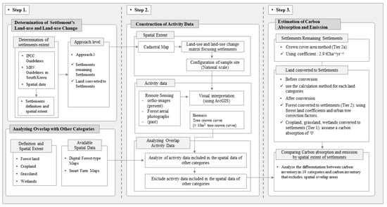 The workflow of this study comprises the following three steps: (1) Defining the spatial extent of settlements: the IPCC and South Korea’s MRV guidelines were reviewed, and available spatial data were selected accordingly. The spatial extent of other land categories’ definitions and spatial data was also used to construct a land use matrix. (2) Constructing activity data based on land use change: activity data based on land use change from 2000 to 2019 was constructed by distinguishing between “Land converted to Settlements” (LS) and “Settlements remaining Settlements” (SS). In addition, overlay analysis was employed to identify the areas where activity data spatially overlap, and the areas where activity data do not overlap with other spatial data, such as forest and cropland. (3) The GHG emission and absorption amount for LS and SS were calculated using the GHG inventory calculation method presented by the IPCC. In addition, when calculating the GHG inventory, the inventory, excluding the areas of spatial overlap based on the definition of other land use categories, was calculated, which provides a pilot calculation of the inventory according to the spatial extent setting of settlements (Figure 2).