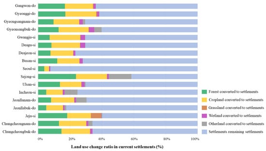By region, CO2 emission in Gyeonggi-do was 4147.40 ktCO2, with an annual emission of 207.37 ktCO2yr−1. Furthermore, CO2 emissions varied according to the proportion of land use types before conversion to settlement, with FS making the largest contribution to CO2 emissions. Depending on the regional characteristics, in Jeollanam-do, areas with a small area of forest land and a large area of cropland before conversion had significant emissions due to CS. Therefore, it was crucial to accurately determine the converted land types to calculate CO2 emissions in LS.