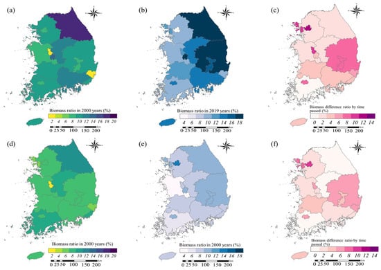 Biomass ratio in SS in 2000 and 2019. (a) Settlement biomass ratio in 2000 based on CDMs. (b) Settlement biomass ratio in 2019 based on CDMs. (c) Biomass difference ratio before and after conversion. (d) Biomass ratio in 2000, excluding the overlapping areas of DFTMs and SFMs. (e) Biomass ratio in 2019, excluding the overlapping areas of DFTMs and SFMs. (f) Biomass difference ratio.