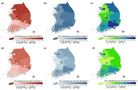 We evaluated the CO2 emission and absorption of the entire settlements in South Korea by combining the results of LS and SS. In 2000, the CO2 inventory was 296.3 ktCO2yr−1. In 2019, CO2 absorption was 622.2 ktCO2yr−1. Furthermore, the annual change in CO2 inventory was an increment of 17.2 ktCO2yr−1. This corresponds to 1.6% of the total CO2 absorption of 39.6 MtCO2yr−1 in South Korea’s AFOLU sector in 2019. The CO2 inventory absorption relative to the settlement area (ha) in 2019 was 0.58 tCO2yr−1 ha−1. By region, Seoul-si showed the highest CO2 absorption rate at 1.82 tCO2yr−1 ha−1. In contrast, CO2 was emitted in Gyeonggi-do (13.90 tCO2yr−1 ha−1), Jeju-do (0.06 tCO2yr−1 ha−1), and Sejong-si (0.65 tCO2yr−1 ha−1) (Figure 6a–c).