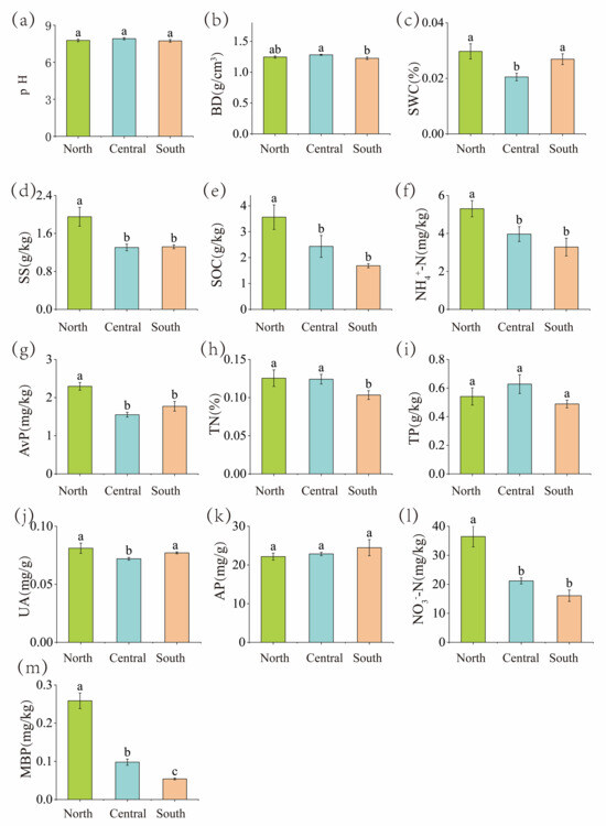 Characteristic values of soil indexes in different regions. Note: Different lowercase letters indicate significant differences between different regions of the same indicator (p < 0.05); (a–m) is the physicochemical content of soil in the north, middle and south of the study area.