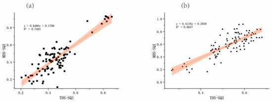 Correlation of soil quality index based on TDS-SQI and MDS-SQI. (a) Evaluation of membership degree function; (b) nonlinear evaluation; The solid red line is the linear fitting line; The black rectangle and triangle are MDS-SQI values.