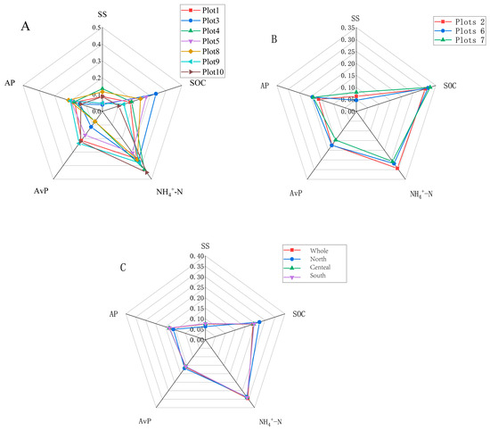 Barriers to soil indicators. Note: (A,B) represent the barrier degrees of plots 1 to 10; (C) represents the radar chart of barrier degrees in different regions.