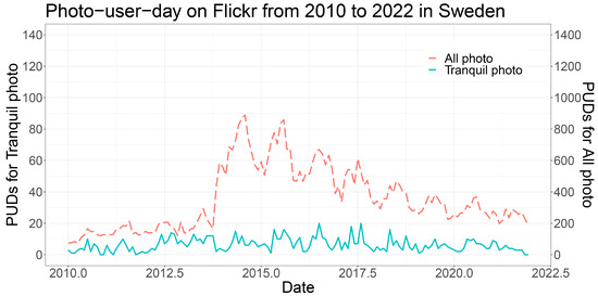 Distribution for photo-user-day of all the Flickr uploads from 2010 to 2022. The blue line indicates the photo-user-day (PUD) of tranquil landscape photos, while the red line indicates the PUD of all photographic uploads on Flickr. Due to the huge differences between the PUDs of the two photo groups, we employ a dual-axis setup to depict the line graph comparing the trends: the left y-axis represents the scale for tranquil landscape photos, while the right y-axis represents the scale for all photo uploads.