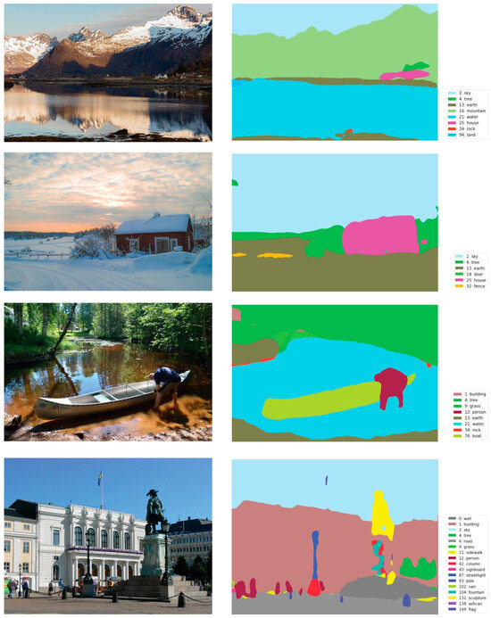 Example of semantic segmentation outputs. The right-side images show the abstract representations of landscape elements shown in the left-side images, such as sky, trees, waterbodies, grasslands, people, etc.
