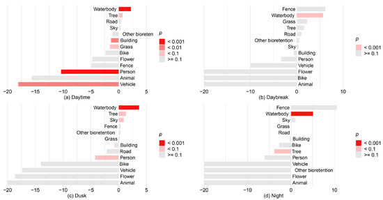 To examine the interactions between landscape elements and time factors, we perform the full regression model with 13 selected variables based on the significant features in the Wald Test (p < 0.1). As shown in Table 3, there are distinguishable impact patterns between different “landscape elements–time” combinations. Waterbody is the only element that obtains a significant positive association with a tranquil experience all the time throughout the day. Sky mainly makes contributions to a tranquil scene at dusk. Most of the other variables, including man-made constructions, greenness, and dynamic elements, mainly show significant associations during the daytime. Trees are another important feature of a tranquil scene except for daybreak. The occurrence of trees relates to more tranquil states during daytime and dusk, but it shows the opposite effect at night. Other vegetation, including grasslands, flowers, and other bioretention, also indicate a negative impact on a tranquil scene. A view with dynamic objects such as people, animals, and vehicles, reduces the possibility of a tranquil experience, especially during the daytime.