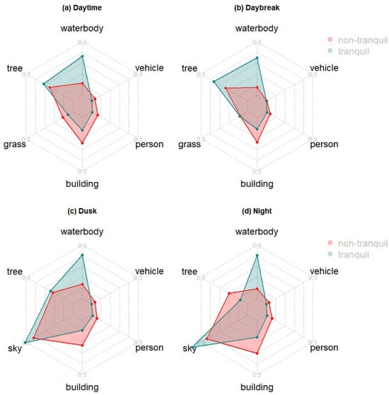 With these two figures, we can describe the visual features of a typical tranquil view in each period. As shown in Figure 5a, a tranquil scene during the daytime contains more waterbodies and trees, fewer grasslands or buildings, and almost no motor vehicles or pedestrians. Although the difference in the average pixels of vehicles and people between the two photo groups is small, these two elements show strong sensitivity to their negative impact, as shown in Figure 4a. In other words, a minor increase in motor vehicles or people significantly decreases the possibility of a tranquil state. Figure 5b suggests that a tranquil view at daybreak consists of more trees and waterbodies, and fewer buildings or people. Only waterbodies show significance in these periods, which may be due to insufficient data (n = 100), as fewer people are taking photographs compared to other periods. People like to take photos of the sky at dusk, and a tranquil-tagged photo usually contains more pixels of water and fewer pixels of buildings according to Figure 5c. Similarly, the difference in the average P of trees, sky, and people is small, but a small change in these landscape features can result in significant changes (p < 0.1) to the tranquility state based on Figure 4c. As for the night, a tranquil view is significantly attached to more waterbodies and fewer trees, while other visual elements are not significant (Figure 4d).