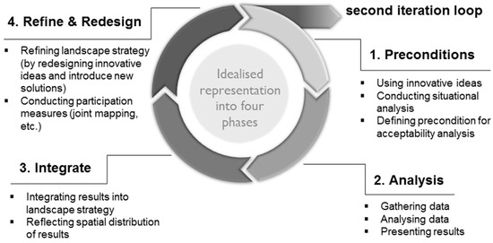 Acceptability analyses of place–based innovations provide crucial in-depth knowledge (e.g., perceptions and values on landscapes) for the social–ecological transformation of landscapes. However, previous acceptability analyses often neglected complex and ongoing processes. We argue that, for the design of a sustainability-oriented transformation and to address spatial and temporal dynamics in landscapes, an operational heuristic is needed; one that integrates acceptability analyses into an adaptive landscape co-design and management approach. Therefore, this conceptual–empirical paper introduces the concept of the ‘acceptability and landscape design cycle’ (ALDC), which is based on findings from various transdisciplinary innovation processes in the Spreewald region (Germany). It is composed of four iterative phases: (1) defining the preconditions for acceptability analysis, (2) conducting the acceptability analysis, (3) integrating the results into the landscape development strategy, and (4) re-designing and refining it. We illustrate the application of these phases using a case study of the cultural landscape in Spreewald. The paper provides practical implementation guidelines of the ALDC and contributes to a better understanding of the dynamics of acceptability decisions regarding the transformation processes of landscapes. Furthermore, it can advance the understanding of how co-evolution of socio-ecological systems occurs.