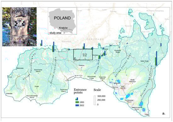 Distribution of tourist traffic in 1993 and 2022 in individual valleys (a). The camera trap installed next to the footpath (photo by: Antoni Zięba) (b). Valleys open to tourists during the period of increased restrictions related to COVID-19 (c). Source: Compiled by authors.