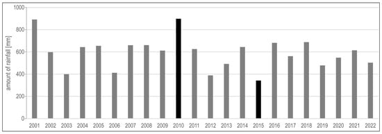 The first part of this study focused on tourist traffic data for the period from 1993 to 2023. Both monthly and annual data were examined. However, the data from 2023 were only partially used because they were not fully processed by the Park, and the data did not account for nonstandard visitors. The source of most of the data is park entry ticket sales. Depending on the year there are between 16 and 18 entry points that are open in TNP. Some tickets are now also sold online. Visitors who do not have to purchase entry tickets, such as local residents from the city of Zakopane and surrounding villages, are still counted as visitors at Park entry points. The next step consisted of an analysis of daily data, mostly for periods with increased tourist traffic in the Park, especially long weekends. Daily data analyses were performed for the years 2010, 2015, and 2021. The year 2010 was selected due to a large decrease in tourist traffic, which may have been due to high precipitation in the summer—the highest on record in the period of 2001–2023. Precipitation data were examined for events exceeding 30 mm in the summer period from June to September for the years 2001–2023. Corresponding daily data were also examined. All the data were obtained from the Zakopane weather station. The authority collecting the data was the Institute of Meteorology and Water Management, which is part of the National Research Institute of Poland. The research showed that 2010 was the wettest year on record in the study period, with the largest share of days featuring precipitation over 30 mm and the largest summer precipitation totals in the study period (Figure 2). The corresponding lowest precipitation total for the summer was noted for 2015. This is why both 2010 and 2015 were selected for the analysis of daily tourist traffic data. The year 2021 was also selected for daily data analysis due to its record-breaking tourist volumes—the highest noted during the study period from 1993 to 2023.