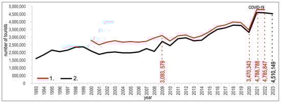TNP tourist traffic data for the period of 1993–2023. Legend: Line 1—number of visitors entering TNP including nonstandard visitors (nonstandard visitors include the following: entries outside the sales points’ operating periods, residents’ entry free of charge, and visitors with large family card). Line 2—number of persons entering TNP without counting nonstandard visitors. Source: Compiled by authors.