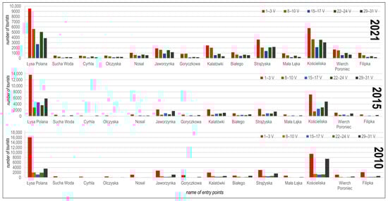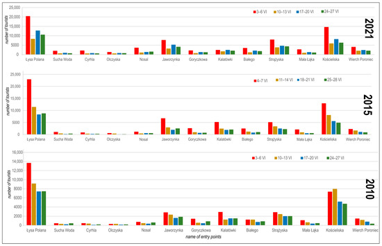 Tourist traffic during the long weekend in June (i.e., Corpus Christi) was also higher than during all other weekends in June; however, the disproportion was not as substantial as that for the May long weekends. The tourist total for 3 June to 6 June, or Corpus Christi, in 2010 at the 13 available Park entry points was 2 to 5.4 times greater than that for each of the subsequent three weekends in June (Figure 5). The Corpus Christi weekend of 4 June to 7 June in 2015 also had a larger tourist volume than that of all the other weekends in June of 2015—ranging from 1.4 to 7.5 times larger. Tourist traffic on the Corpus Christi weekend of 3 June to 6 June of 2021 was 1.2 to 4.2 times larger than that for all the other weekends in June of 2021. The precipitation total for June in the studied period was as follows: 236 mm in 2010, 83.3 mm in 2015, and 74.8 mm in 2021. It is worth emphasizing that the most tourists came to Rybi Potok Valley and Kościeliska Valley during the May and June long weekends (Figure 4 and Figure 5).
