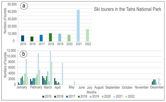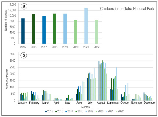 In this article we also showed how the pandemic period influenced the volume of tourist traffic in relation to ski tourers, rock climbers, and spelunkers. Data for these forms of tourism were analyzed for the period of 2015–2022. TNP also collects data on ski tourers entering the Park. These are counted by the sellers at park entry tickets points. In addition, persons pursuing extreme skiing, which includes snowboarding, on dedicated trails are required to register their entry into the Park through the use of a special website. TNP also requires rock climbers to register their activity, thus yielding more statistics data. It is illegal to climb in the Tatra National Park without free registration. Climbers can register their activity in the dedicated books found at tourist shelters located in the Rybi Potok Valley and Hala Gąsienicowa Valley. They can also register using a special website or via a smartphone application. The number of spelunkers visiting Tatra National Park is recorded in a dedicated database. Every spelunker who wishes to visit caves in the Park must register online using a special website or via the smartphone application. Unregistered visits in caves are considered illegal.
