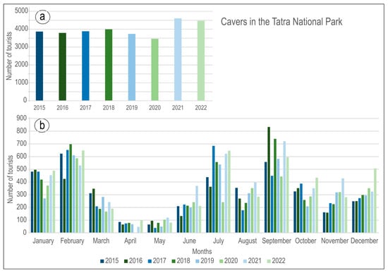 Number of spelunkers per year (a) and per month (b) in the years 2015–2022. Source: compiled by authors.