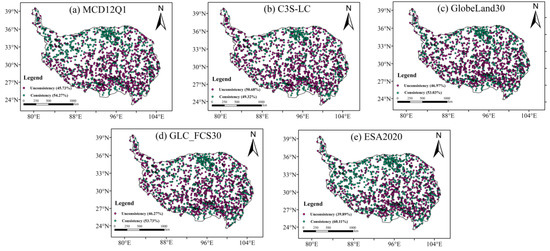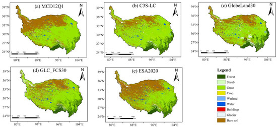 To offer a reliable guide for LC data selection for ecological and climate change studies at the TP, the performance and consistency of five LC products from satellite remote sensing datasets, including MCD12Q1, C3S-LC, GlobeLand30, GLC_FCS30, and ESA2020 at a 500 m spatial resolution, were assessed through areal comparison, error matrix evaluation, and spatial confusion methods. The key conclusions are the following: