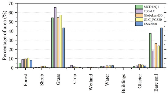 At the same time, the five LC datasets utilized in this study have different resolutions, projected coordinates, and land classification schemes. For facilitating convenient interoperability and cross-comparison among the five different products, during the data preprocessing process, we used the maximum area aggregation to harmonize data of various resolutions to a 500 m resolution. The coordinate systems and projections of all products were unified. The classification schemes of all products were converted into nine standardized LC types [51]. Although all of these preprocessing processes are commonly used when making land cover comparisons [37,60], they may introduce some uncertainty. For instance, in MCD12Q1, shrub includes closed shrubs. In C3S-LC and GLC_FCS30, shrub is classified as evergreen shrub or deciduous shrub. In both GlobeLand30 and ESA2020, there is only a single classification of shrubs but with different definitions. Specifically, shrub in GlobeLand30 is defined as land covered by shrubs with an excess of 30% shrub cover, including mountain shrub, deciduous and evergreen shrub, and desert shrub with more than 10% coverage in desert areas. In contrast, the ESA2020 shrub classification pertains to geographical regions primarily characterized by the predominant presence of natural shrubs, with a minimum vegetation cover of 10% [25]. The LC classification schemes and type definitions on a global scale inevitably influence the application and analysis of LC products in local areas, particularly the unique plateau area of the TC. Moreover, the distinction between grass and shrub based on vegetation canopy thresholds could directly impact their classification, and bare soil, shrub, and various other forms of LC types exhibit a high degree of similarity [26]. Therefore, it is necessary to minimize the ambiguities and uncertainties in each LC type, specifically regarding the vegetation coverage and the threshold of vegetation canopy of forest, grass, and shrub.