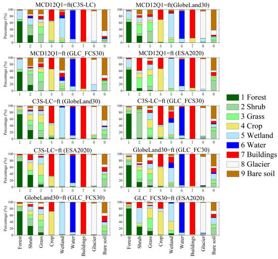 MCD12Q1 is from the National Aeronautics and Space Administration (NASA) (https://ladsweb.modaps.eosdis.nasa.gov, accessed on 8 January 2023); C3S-LC is from the European Space Agency (ESA) (https://www.esa-landcover-cci.org, accessed on 2 January 2023); GlobeLand30 is from the National Geomatics Center of China (NGCC) (http://www.globallandcover.com, accessed on 20 January 2023); GLC_FCS30 is from the Aerospace Information Research Institute, Chinese Academy of Sciences (AIR, CAS) (https://data.casearth.cn/sdo/detail/5fbc7904819aec1ea2dd7061, accessed on 25 January 2023); ESA World Cover 2020 (ESA2020) is from the European Space Agency (ESA) (https://esa-worldcover.org/en, accessed on 16 January 2023). The Geo-Wiki Global Validation Sample Set is from the Geo-Wiki crowdsourcing platform (https://zenodo.org/communities/geo-wiki, accessed on 6 February 2023), the Global Land Cover Validation Sample Set is from the Zendo (https://zenodo.org/record/3551995, accessed on 10 February 2023), the Global Observation for Forest Cover and Land Dynamics (GOFC-GOLD) is from the GOFC-GOLD land cover project office (http://www.gofcgold.wur.nl/sites/gofcgold_refdataportal.php, accessed on 15 February 2023), the US Geological Survey (USGS) Global Land Cover Reference Dataset is from the USGS ScienceBase platform (https://www.sciencebase.gov/catalog/item/6116c890d34e3267c611bfdd, accessed on 21 February 2023).