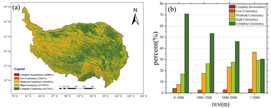 The TP is a vital ecological safety barrier zone in China and a key region for global biodiversity conservation [55,56]. Therefore, the spatial extent, area, and distribution of grass, bare soil, forest, and water in the TP holds significant strategic importance for enhancing the stability of the plateau’s ecological security barrier functions. Comparing these results with a previous study, we agree that the LC types of the TP exhibit a comparable distribution across various products, and that the forest area is smaller compared to grass and bare soil [51]. The complete and high consistency of five distinct LC products accounted for 71.48% of the total area proportion. In terms of LC types, water, grass, and forest exhibited high levels of accuracy. However, significant deviations were observed among the other LC types. For example, the evaluation indicated that the shrub, wetland, crop, and glacier types displayed extremely poor consistency (with areas showing complete inconsistency and low consistency of these LC types accounting for 99.98%, 96.40%, 91.26%, 88.2%, and 68.86%, respectively). This discrepancy may arise from variances in satellite data sources, processing methods, definition of LC type, and classification schemes [27,32,57,58]. Over the past few decades, numerous sensors have been mounted on a series of satellites that are designed to detect and measure different forms of energy and signals emitted from the Earth’s surface. For example, the Aqua and Terra satellites are equipped with MODIS, while Landsat 4/5 has the Thematic Mapping sensor, Landsat 7 features the Enhanced Thematic Mapper Plus, and Landsat 8 is equipped with the Operational Land Imager. Additionally, the Sentinel-1 carries the SAR-C, the Sentinel-2 has the MultiSpectral Instrument, and the Ocean and Land Colour Instrument is installed on the Sentinel-3 [22,45,46]. This wide variety of sensors encompasses a diverse range of bands and resolutions. In addition, elevation heterogeneity may influence the consistency of different LC products. For example, some researchers have indicated that higher elevations pose greater challenges in monitoring and detecting LC inconsistencies [38,59]. The low-altitude areas are characterized by fairly flat terrain and homogeneous vegetation, while the high-altitude areas exhibit complex topography with heterogeneous features at various resolutions, which may result in increased inconsistency among different LC products.