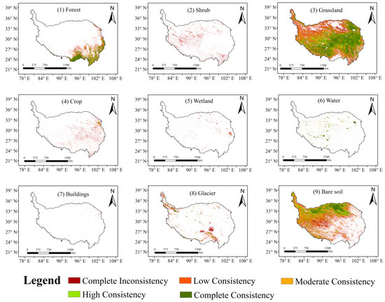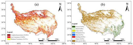 - Cai, L.; Wang, S.; Jia, L.; Wang, Y.; Wang, H.; Fan, D.; Zhao, L. Consistency Assessments of the Land Cover Products on the Tibetan Plateau. IEEE J. Sel. Top. Appl. Earth Obs. Remote Sens. 2022, 15, 5652–5661. [Google Scholar] [CrossRef]