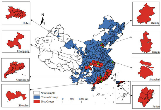 Within this study, the CET pilot initiative is conceptualized as a quasi-natural experiment, with the interaction term (DID) between the policy implementation time dummy and the pilot region dummy serving as the central explanatory variable. If a city is classified as a CET pilot area, the area dummy variable is taken to be 1 to represent the treatment group; otherwise, it is 0 to represent the control group. At the same time, the time dummy variable assumes the values of 0 and 1 prior to and following the policy’s enactment. Therefore, the DID coefficient reflects the net influence of the CET pilot affecting the urban LGUE. The CET pilot policy has undergone multiple iterations, necessitating the rigorous selection of experimental cohorts to ensure scientific validity. As such, this paper includes provinces and cities subjected to the CET pilot policy across several phases (Beijing, Shanghai, Tianjin, Chongqing, Hubei, Guangdong Province (Shenzhen City), and Fujian). The time of the implementation of the CET pilot policy was 2013, 2014, and 2016, respectively.